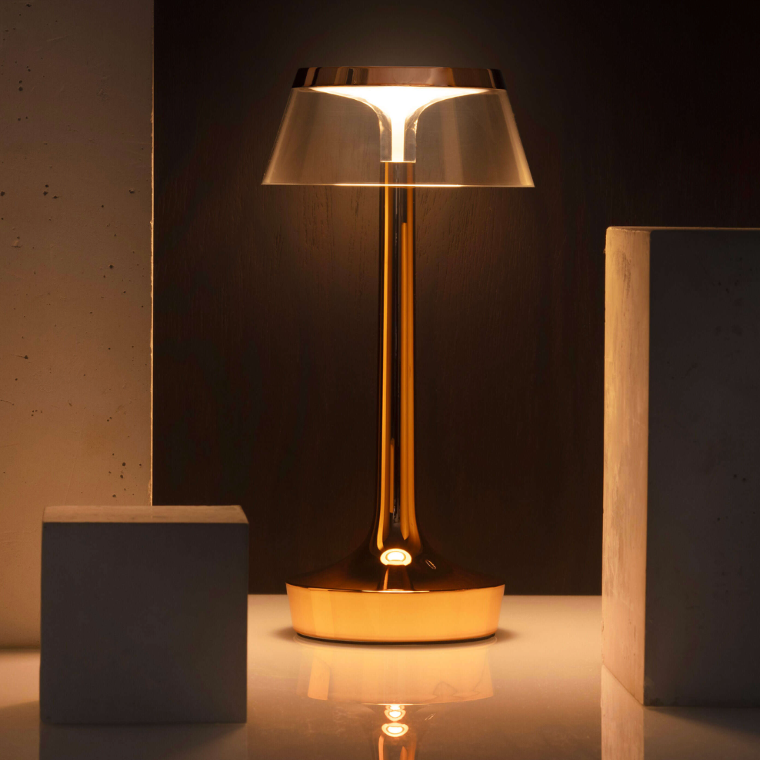 Lámpara portátil recargable Bon Jour Unplugged, diseño de Philippe Starck para Flos en 2015. Nacida como la versión inalámbrica de su hermana mayor, la Bonjour. conserva la misma elegancia estructural y pureza formal, incorporando libertad absoluta de movimiento.