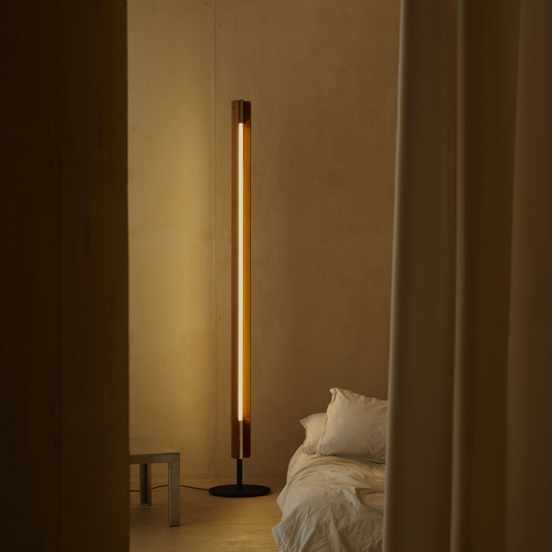En la parte superior, el difusor proyecta una luz suave y envolvente que contrasta con la materialidad cálida de la madera. El resultado es una lámpara escultórica pero serena, capaz de convertirse en punto focal sin imponerse al espacio.